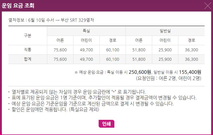 - 특실 서비스요금은 할인되지 않으며(운임만 할인), 최저운임 이하로는 할인되지 않음