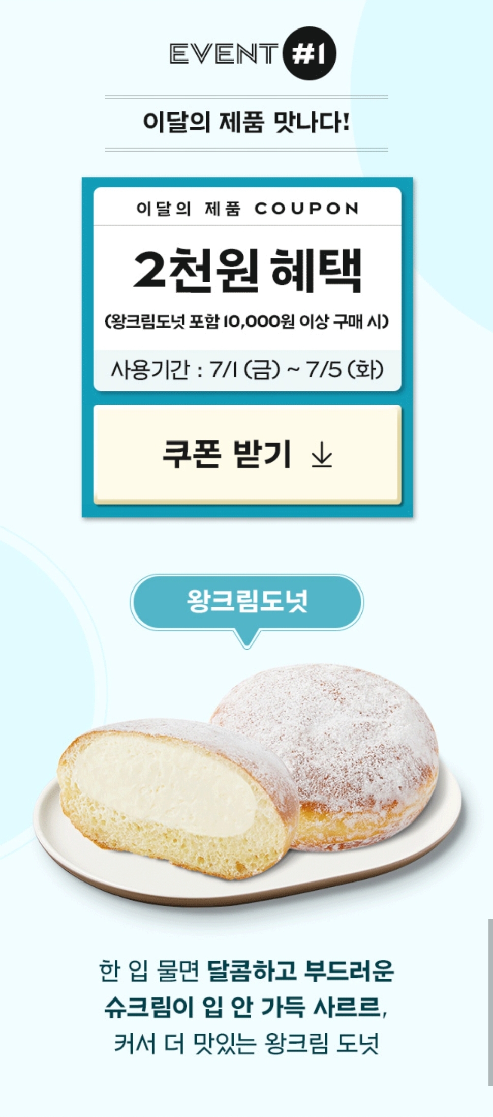- 이달의 제품 쿠폰은 왕크림도넛 포함 10,000원 이상 구매 시 2,000원 할인해 드리는 행사 입니다.(혜택기간 : 7/1~5)