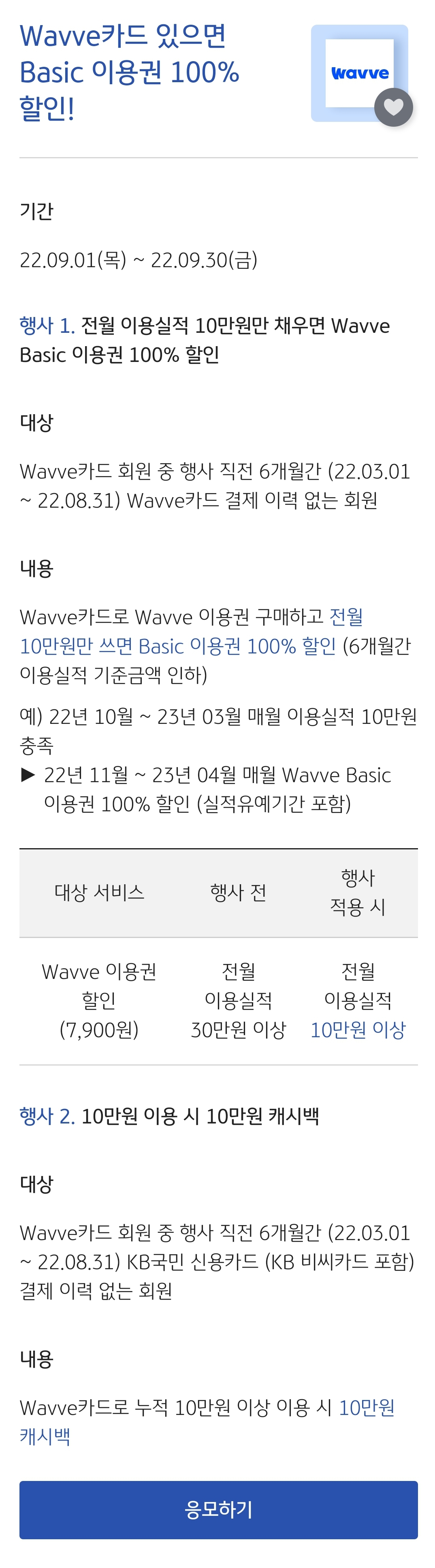 Wavve 이용권 할인서비스 외 Wavve카드 상품서비스는 전월 이용실적 30만원 이상 시 제공