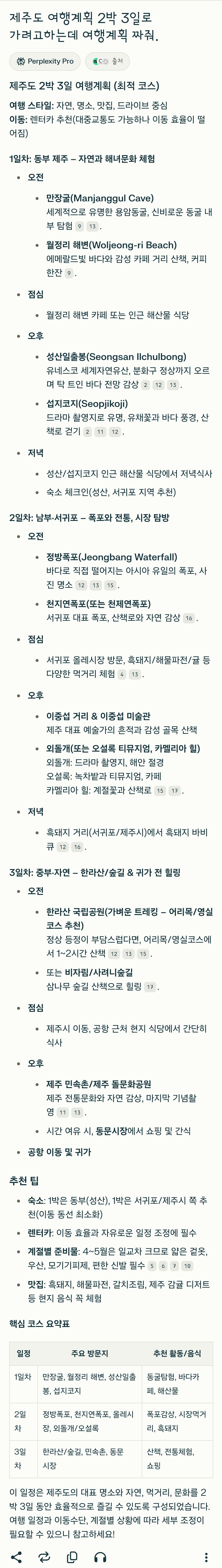 이 일정은 제주도의 대표 명소와 자연, 먹거리, 문화를 2박 3일 동안 효율적으로 즐길 수 있도록 구성되었습니다.