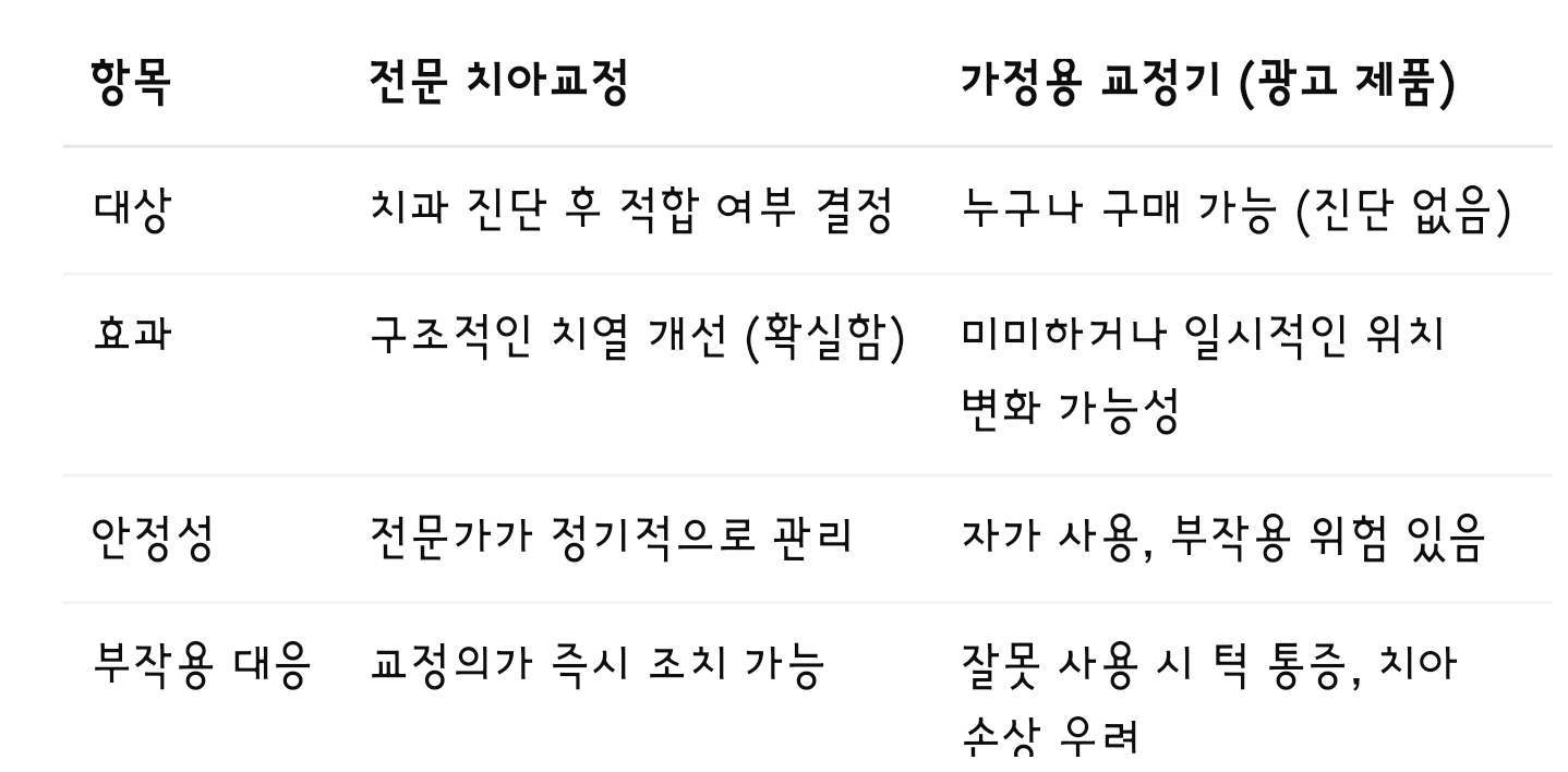 좋은 질문이에요! 이 광고에 나오는 "집에서 하는 가정용 치아 교정기"는 일반적으로 우리가 치과에서 받는 **전문 치아교정(교정 전문의가 하는 브라켓/투명교정 등)**과는 완전히 다른 제품이에요. 아래에 몇 가지 중요한 포인트를 정리해 드릴게요: