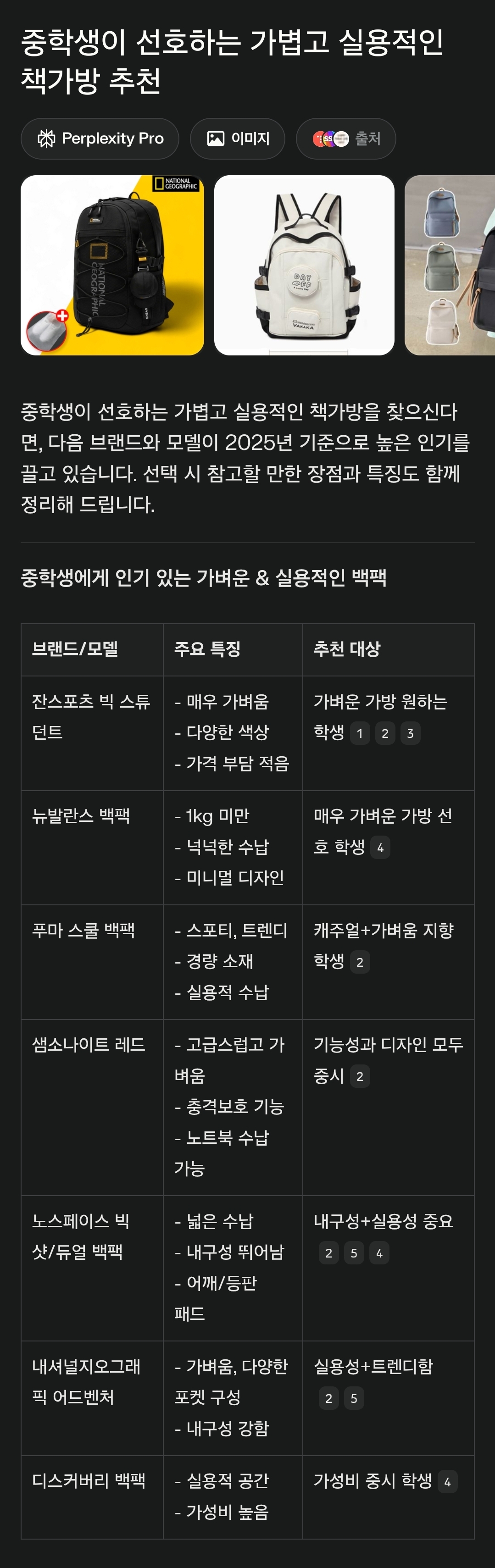 오늘은 퍼블렉시티에게 중학생이 선호하는 가볍고 실용적인 책가방을 추천해 달라고 했어요.^^